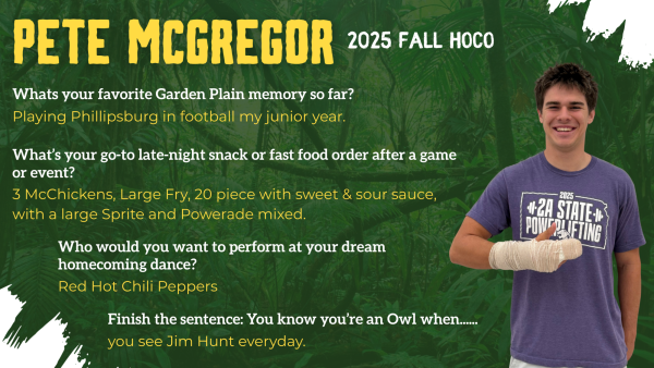 Pete McGregor is a senior at Garden Plain High School. He is a two sport athlete who plays basketball and football. His biggest motivations are to push himself to be the best and to be a good person as well as player. When asked about football, he said that he is very excited to see what this season has in store for the Owls, and he thinks GPHS will be successful this year. After high school, Pete plans on going to a college or a trade school. He hopes to write about the community and sports of Garden Plain.